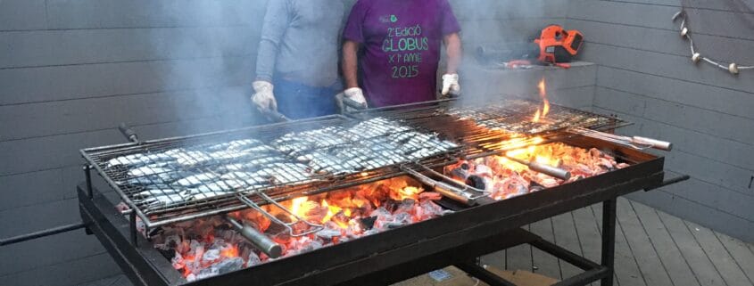 Grilled sardines, green salad, local sausages, bread with tomato, water, wine, dessert and coffee.